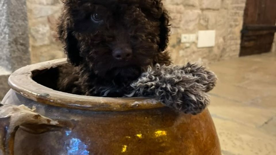 Un cucciolo di Lagotto Romagnolo marrone, vivace, brillante e irresistibile… pronto a conquistare tutti con la…