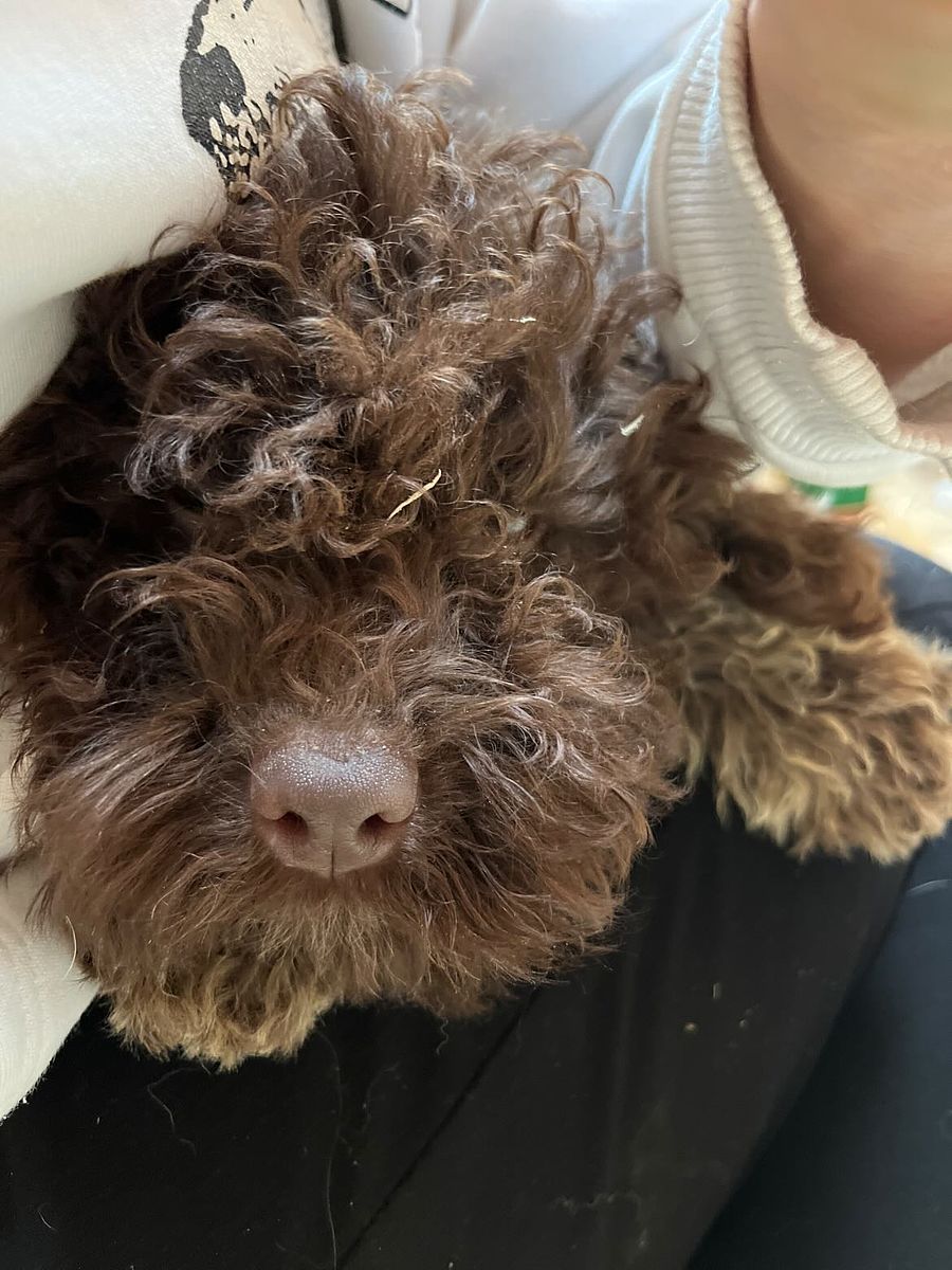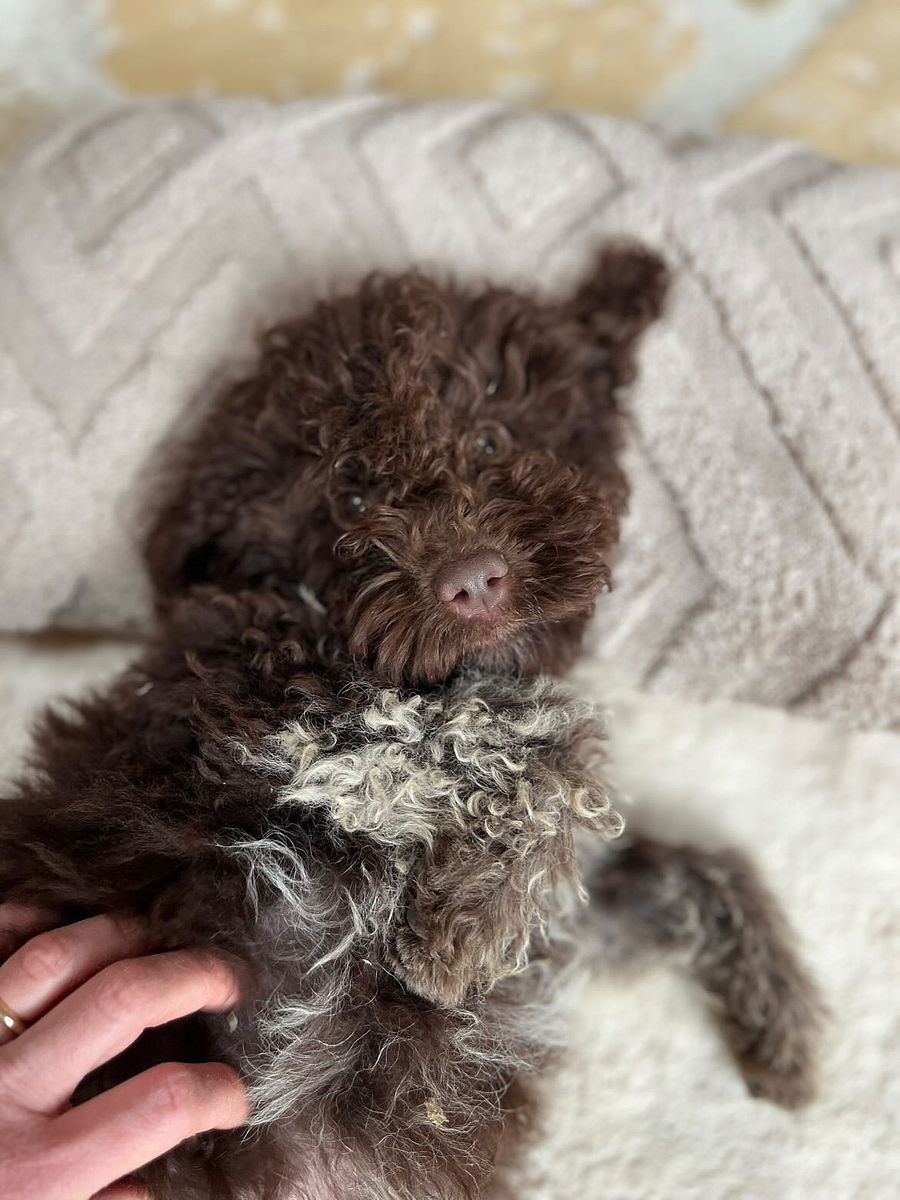 Girotondo è un cucciolo di Lagotto Romagnolo che incarna pienamente la dolcezza e la sensibilità tipiche della razza. Il suo mantello è marrone, impreziosito da armoniose chiazze bianche e leggere roanature che gli donano un aspetto elegante e molto espressivo.