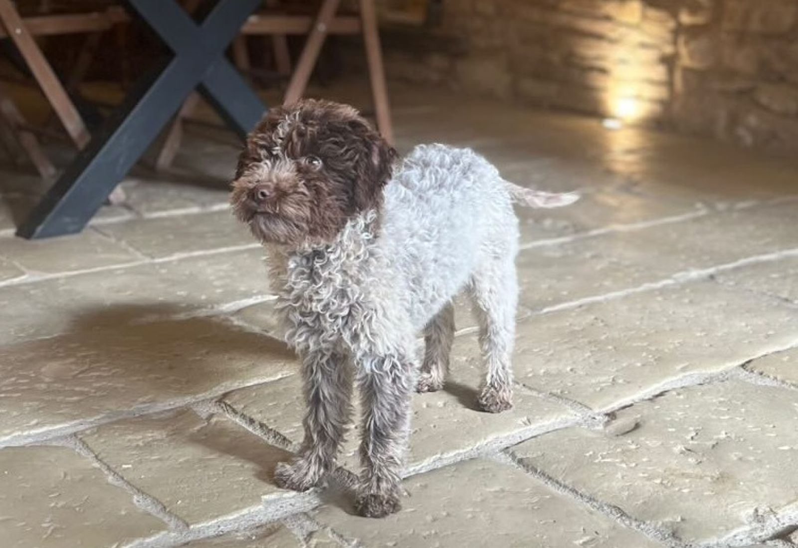 Peach è una graziosa cagnolina di razza Lagotto Romagnolo che conquista al primo sguardo per il suo carattere vivace e la sua espressione attenta e intelligente. Di taglia medio-piccola, presenta un manto bianco e marrone con un riccio ben definito e di buona qualità, tipico della razza, che valorizza una struttura armoniosa ed equilibrata.