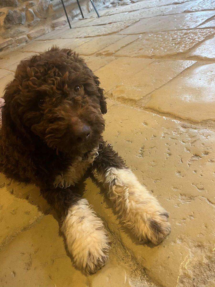 Crush è un giovane Lagotto Romagnolo di circa 6 mesi che colpisce subito per la sua ottima struttura e per il riccio ben definito, tipico della razza. Il suo manto marrone, impreziosito da eleganti calzini bianchi, gli dona un aspetto armonioso e particolarmente raffinato.
