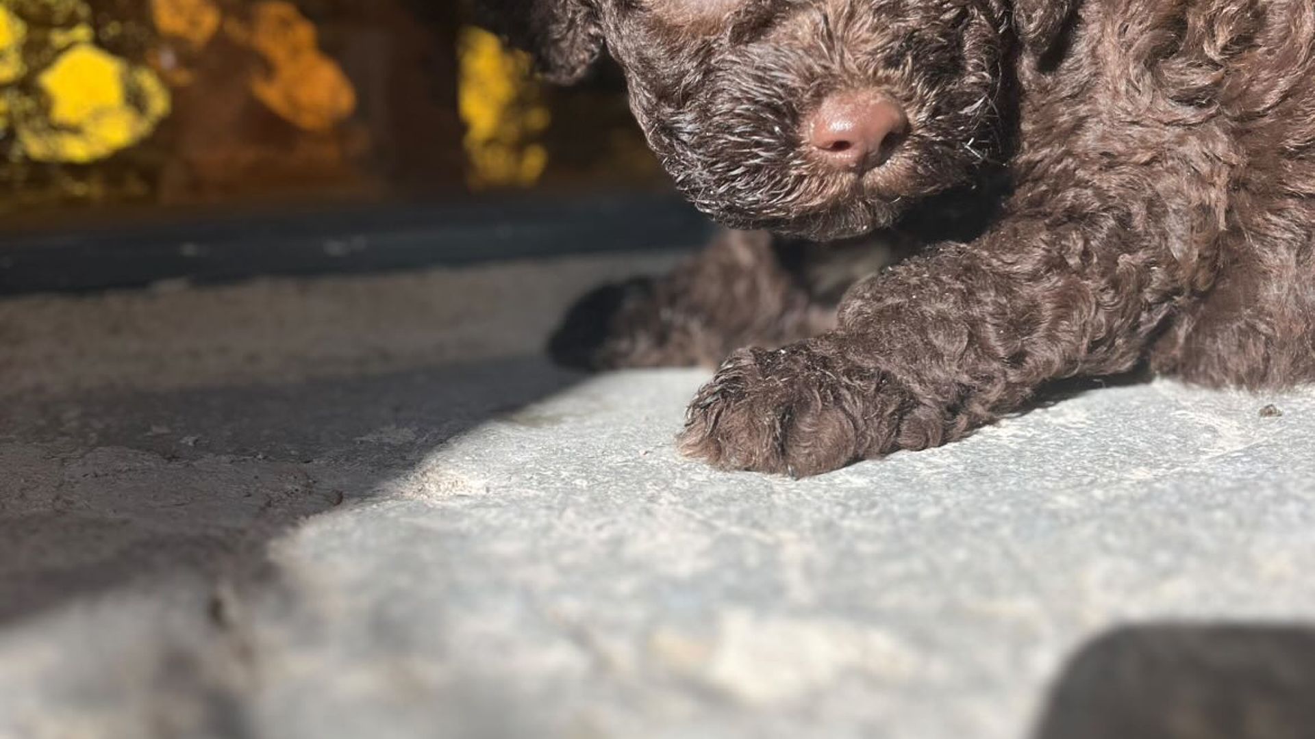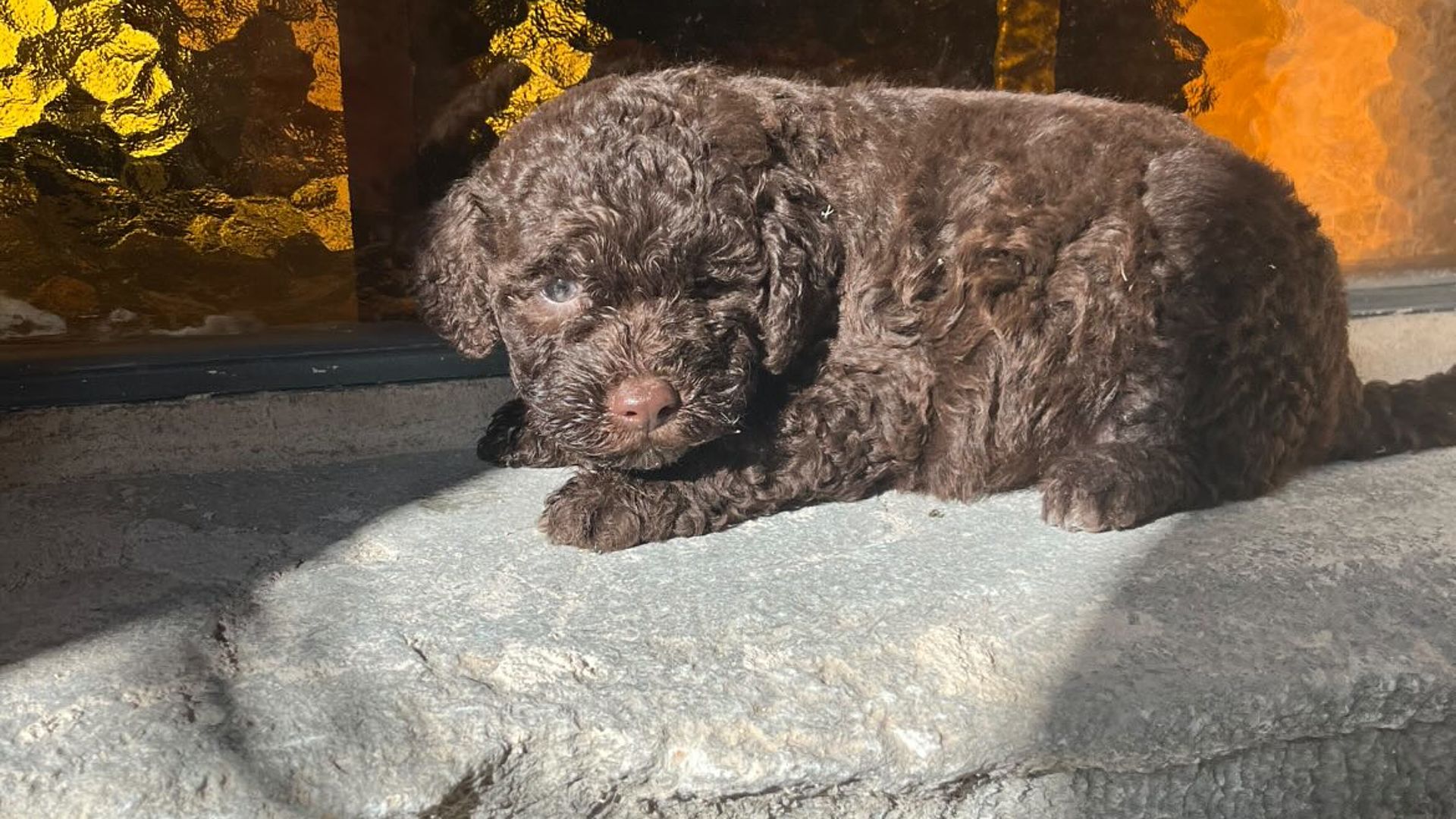 Gotico è un cucciolo di Lagotto Romagnolo dal mantello marrone caldo e uniforme. Il suo nome evoca atmosfere antiche e un fascino riservato, perfettamente in linea con il suo temperamento delicato e riflessivo.