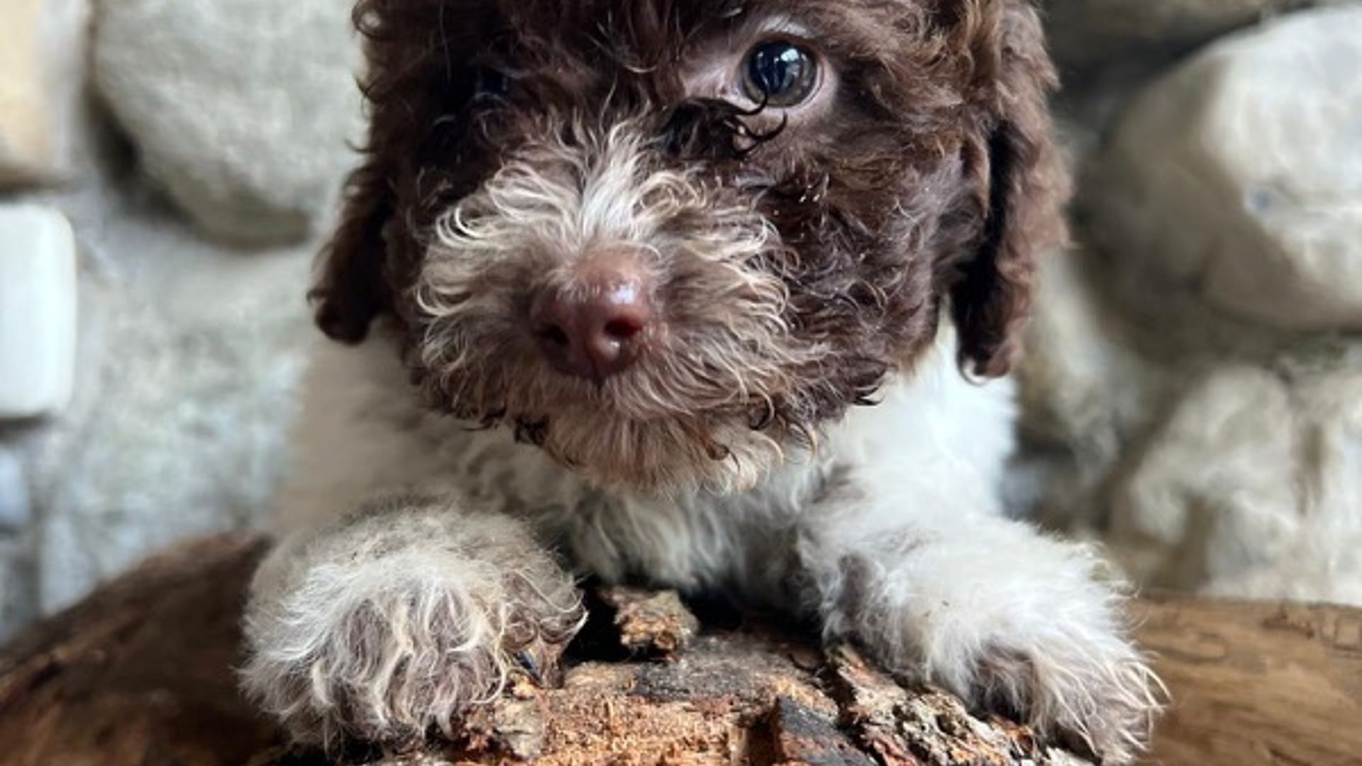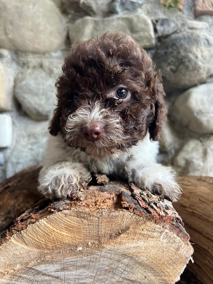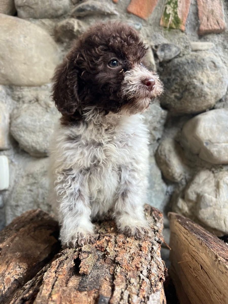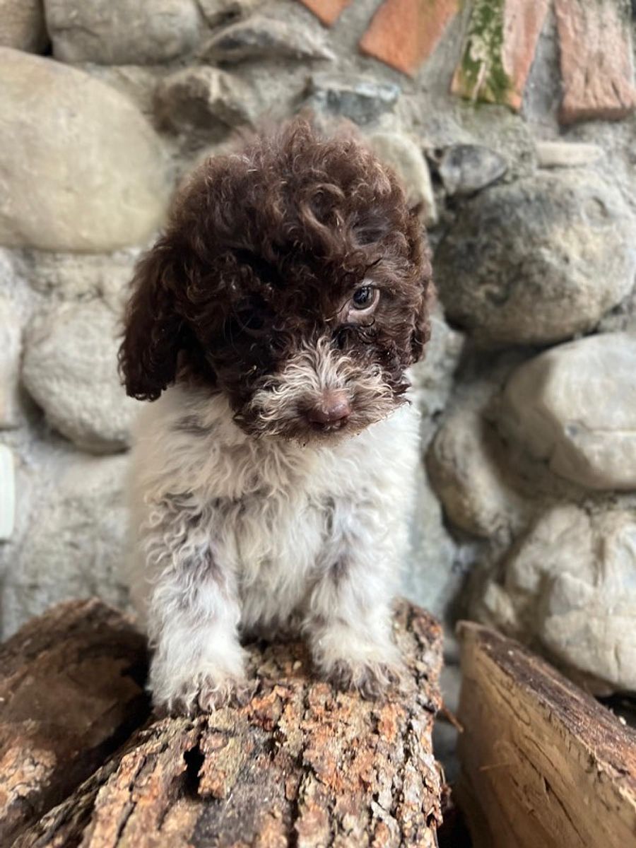 Soia è una giovane femmina di Lagotto Romagnolo dal mantello bianco e marrone, figlia della nostra Nutella, da cui ha ereditato eleganza, tipicità e un carattere sensibile. Fin dai primi giorni ha mostrato un temperamento delicato e riflessivo: è una cucciola timida nei primi approcci, ma profondamente interessata al rapporto con l’uomo, che osserva con attenzione e desiderio di fidarsi.