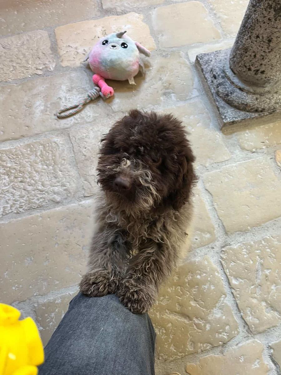 She is a very sweet puppy, with a strong attachment to her human, which manifests itself in her constant search for contact and collaboration. She is lively and responsive, ready to respond to stimuli and eager to learn. This combination of sensitivity, intelligence, and dynamism makes her an ideal companion both for family life and for any dog-related activities, where the Lagotto expresses its natural qualities to the fullest.