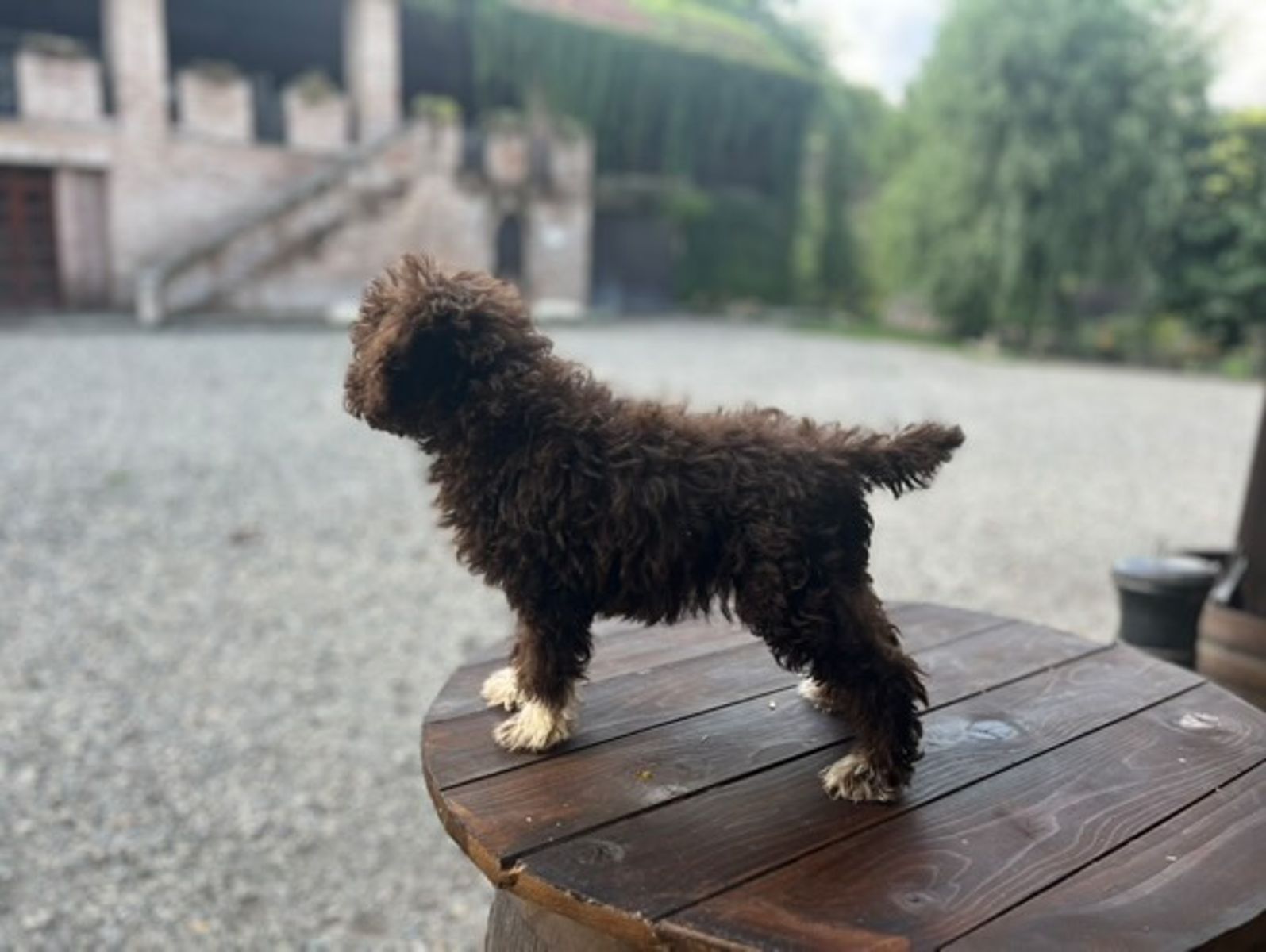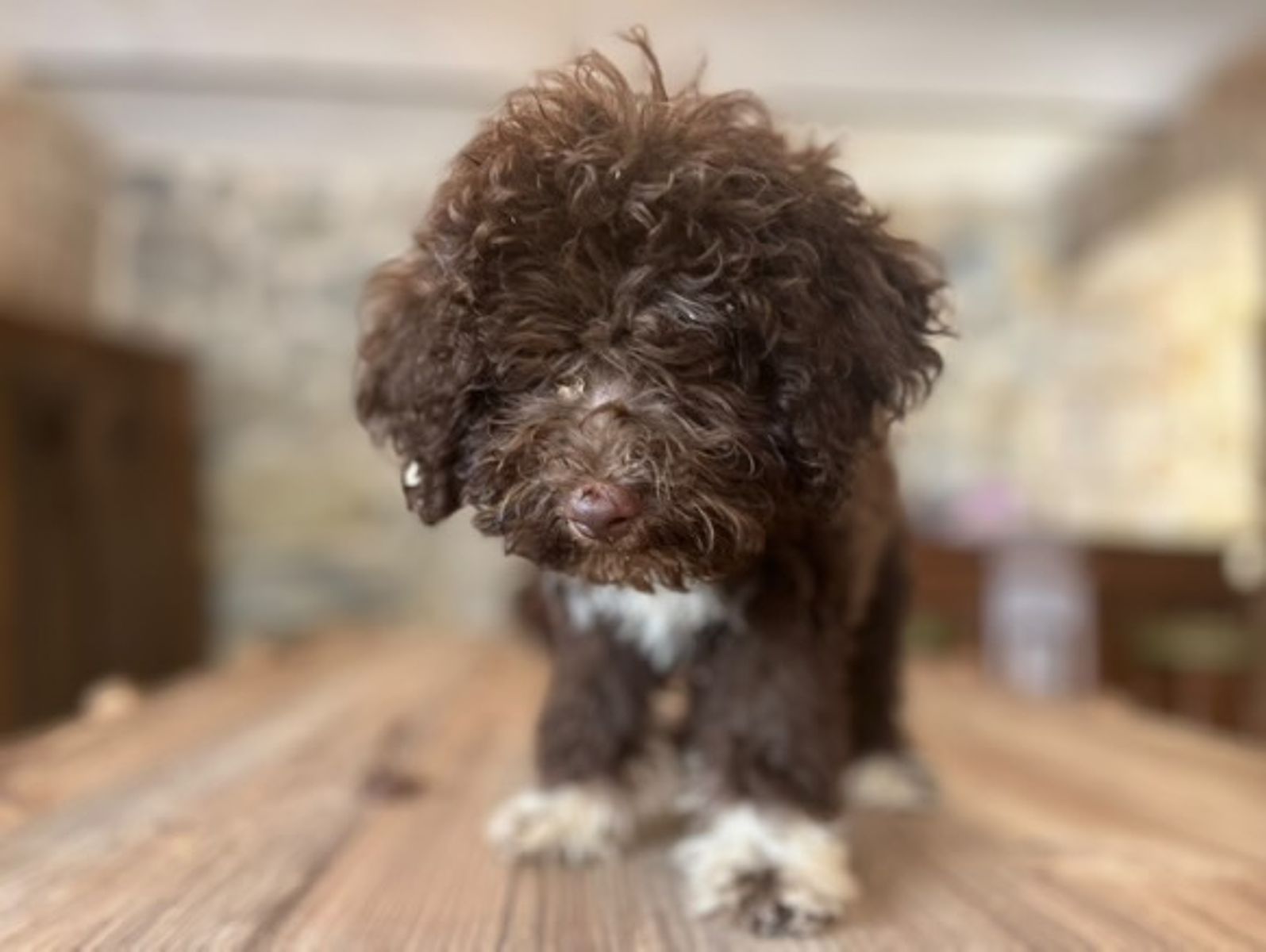 Female Lagotto Romagnolo puppy, born June 4, 2025, brown with white paws. As she is very young, the white socks may change shape or even disappear over time. Selected bloodline, balanced and typical of the breed: harmonious build, thick, curly coat, excellent temperament. She is raised in a family environment, socialized from day one with people and other dogs, and carefully monitored for her diet and well-being. She is an ideal future companion and, for those who desire, has excellent natural predisposition for truffle hunting. She will be delivered with a pedigree, microchip, vaccinations, and veterinary certificates.